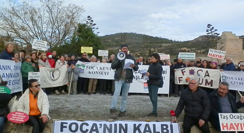 İzmir’in Foça İlçesi’ne bağlı kırsal Yenibağarası Mahallesi Bahçecik Mevkiinde taş ocağı açılmak istenmesi ilçe halkını isyan ettirdi. 2 bin 500 yıllık Pers Mezar Anıtı’na çok yakın olmasının yanısıra, zeytinlikler, arıcılık, hayvancılık, tarım alanları ve doğal SİT alanı içinde kalan bölgede taş ocağı açılmaması için yüzlerce kişinin katıldığı bir eylemle basın açıklaması yapıldı. Katılımcılar attıkları sloganlar, taşıdıkları döviz ve pankartlarla taş ocağının asla kabul edilmeyeceğine dair tepkilerini ortaya koydular.