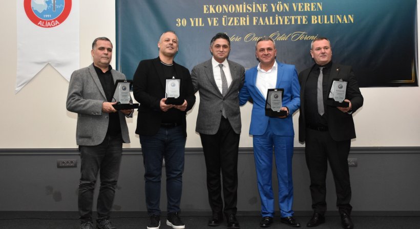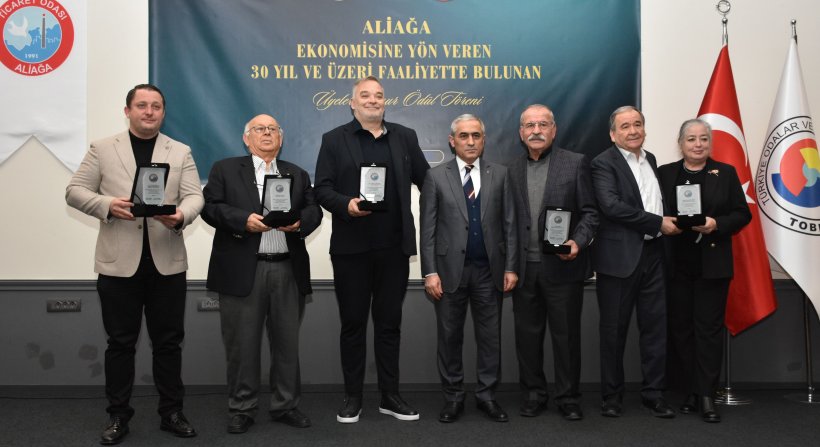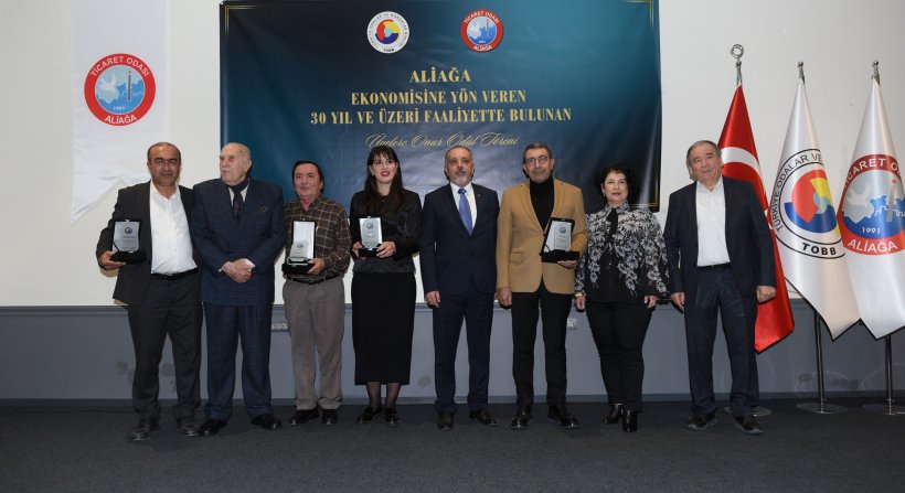 Yapılan konuşmaların ardından isimleri okunarak tek tek sahneye davet edilen 30 yıl ve üzeri Aliağa Ticaret Odası üyesi 92 kuruluşa onur ödülleri verilerek toplu fotoğraf çekildi.
