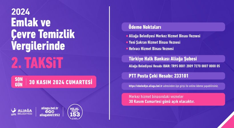 Her yıl iki taksit halinde ödenen Emlak ve Çevre Temizlik Vergisinde 2. taksit ödemeleri 30 Kasım 2024Cumartesi günü son buluyor.Vatandaşlar emlak borcu olup olmadığını bağlı bulunduğu belediyelerden öğrenebiliyor. Aliağa’da gayrimenkulü bulunanlar Aliağa Belediyesi’nin https://ebelediye.aliaga.bel.tr adresinden üye girişi ile online ödeme yapabiliyor. Ödemelerini belediye veznesinden yapmak isteyenler için merkez hizmet binasında bulunan vezne servisleri 30 Kasım Cumartesi günü de hizmet verecek.