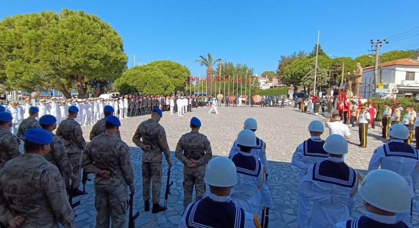 Cumhuriyet Meydanı’ndaki Atatürk Anıtı önünde yapılan ilk tören Jandarma Komando Okulu Bandosunun çaldığı marşlarla başladı. Törene; Foça Kaymakamı Mehmet Türköz, Garnizon Komutanı Vekili Amfibi Deniz Piyade Tugay Komutanı Tuğamiral İbrahim Özdoğan, Belediye Başkanı Fatih Gürbüz, Ak Parti, CHP, MHP ve İyi Parti İlçe Başkanları, daire ve şube müdürleri, bazı STK temsilcileri, gaziler, gazi yakınları, öğretmen ve öğrenciler ile vatandaşlar katıldı. Kaymakamlık, Türk Silahlı Kuvvetleri, Belediye Başkanlığı ve Foçalı Gaziler adına çelenklerin konulmasından sonra tören, saygı duruşu ve İstiklal Marşı’nın okunmasıyla devam etti.