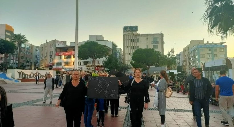 Kadınlar adına konuşan Eren Saran, "Kadınlar ülkede, dünyada barış gelene kadar mücadele etmeye devam edecek. Bizler Aliağa'lı Kadınlar olarak Filistin halkı yalnız değildir diyoruz" dedi