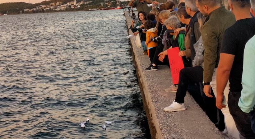 Aliağa'lı kadınlar da basın açıklamasının ardından bir yürüyüş gerçekleştirerek Filistin'de ölen çocuklar adına denize kağıttan gemiler bıraktı