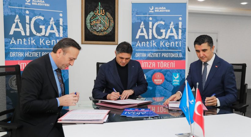 Halen yılda 15 bin tarih ve arkeoloji meraklısının ziyaret ettiği Aliağa- Manisa sınırında bulunan Aigai Antik kentinde devam eden arkeolojik kazıların desteklenmesini içeren protokol, Aliağa Belediyesi, Manisa İl Kültür ve Turizm Müdürlüğü ve Aigai Kazı Başkanlığı arasında imzalandı. Aliağa Belediye Başkanlık makamında gerçekleşen protokol imza törenine; Aliağa Belediye Başkanı Serkan Acar, Manisa İl Kültür ve Turizm Müdürü İbrahim Sudak ve Aigai Arkeolojik Kazı Başkanı, Celal Bayar Üniversitesi Fen-Edebiyat Fakültesi Arkeoloji Bölümü Öğretim Üyesi Prof. Dr. Yusuf Sezgin katıldı.