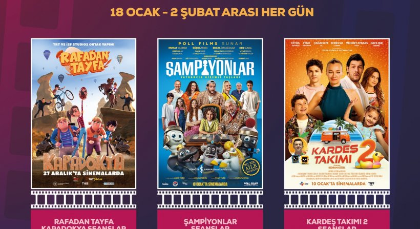 Aliağa Gençlik Merkezi Sinema Salonu’nda 18 Ocak 2025 Cumartesi günü başlayacak sinema şöleni 2 Şubat 2025 Pazar günü sona erecek. Öğrenciler sinema keyfini Aliağa Gençlik Merkezi Erşan Park’ta her gün 10.45 – 20.15 saatleri arasındaki seanslarda ücretsiz olarak gösterime sunulacak; ‘Rafadan Tayfa: Kapadokya’, ‘Şampiyonlar’, ‘Kardeş Takımı 2’ filmleriyle yaşayacak. Aliağa Belediyesi, sinema günleri boyunca 20-21 ve 22 Ocak tarihlerinde çevre mahallelerde ikamet eden çocuklar için Aliağa Gençlik Merkezi’ne ücretsiz ulaşım hizmeti verecek.