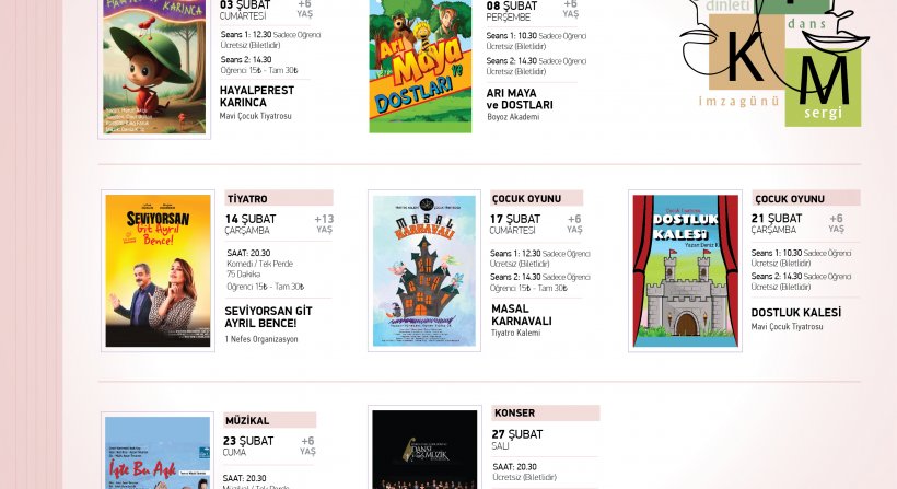 3 Şubat’ta çocuk tiyatrosu ile başlayacak etkinliklerde, Mavi Çocuk Tiyatrosu’nun sahneleyeceği “Hayalperest Karınca” oyunu 2 seans sahne alacak. 8 Şubat’ta Boyoz Akademi’nin “Arı Maya ve Dostları” oyunu sadece öğrencilere özel ücretsiz olarak Bergama Kültür Merkezi’nde gösterime girecek.