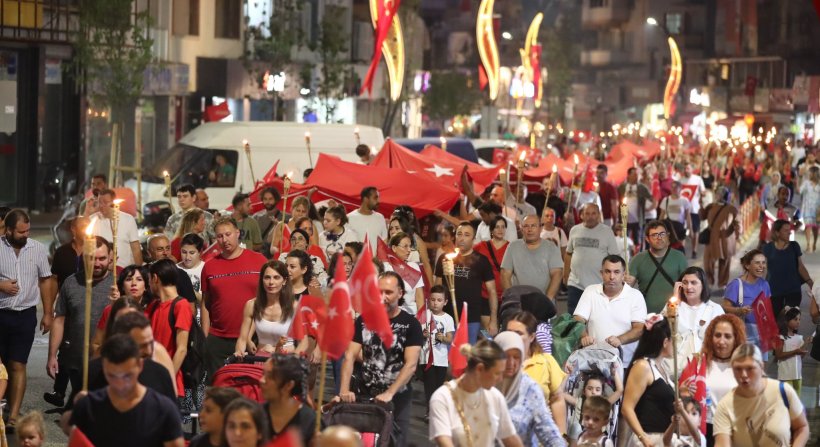 Aliağa Belediyesi, kutlamalar öncesi kentin ana caddelerini Türk Bayrakları ve dev Atatürk posterleriyle donatırken büyük zaferin coşkusuna ortak olmak isteyen Aliağalılar, fener alayı için Enka Spor Salonu önünde toplandı. Küçükten büyüğe binlerce Aliağalı Türk Bayrakları, dev Atatürk posterleri ve meşaleler ile Avcı Ramadan Çocuk Oyun ve Rekreasyon Alanı’na yürüdü. Belediye bandosu eşliğinde gerçekleştirilen yürüyüşe Aliağa Belediye Başkanı Serkan Acar, belediye meclis üyeleri, siyasi parti yöneticileri, stk temsilcileri, motorlu ve bisikletli gruplar ile binlerce Aliağalı katıldı. Kimi vatandaşlar da evlerinin balkon ve pencerelerine çıkarak ellerindeki Türk Bayraklarıyla coşkuya ortak oldu.