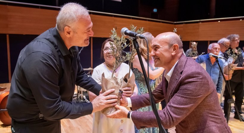Gecenin sonunda Başkan Soyer sanatçılara zeytin fidanı verdi.