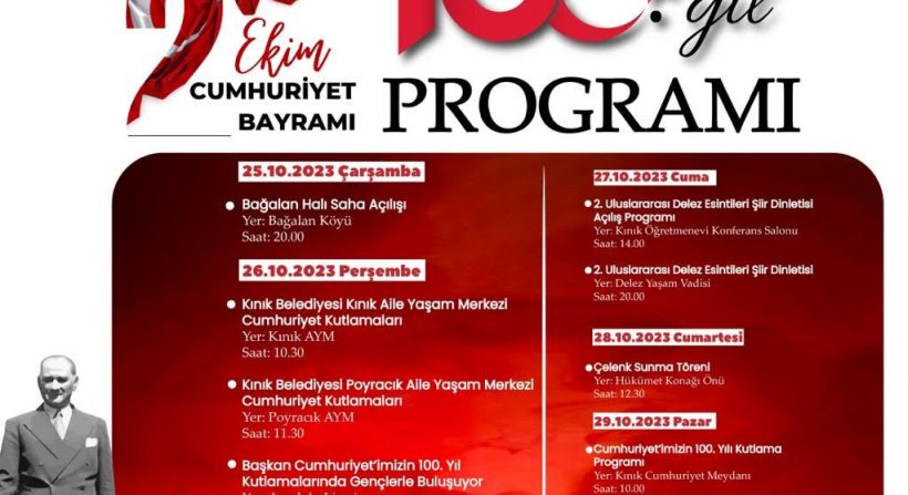 Kınık’ta Cumhuriyet’in 100. Yılı Programı kapsamında, 25 Ekim Çarşamba günü saat 20:00’da Bağalan Halı Saha Açılışı ile başlayacak bayram etkinlikleri, 26 Ekim Perşembe günü Zara konseri ile Kınıklılara coşkulu anlar yaşatacak. 27 Ekim Cuma günü Kınık Belediyesi Sosyal Tesisi olan Delez Yaşam Vadisi’nde 2. Uluslararası Delez Esintileri Şiir Dinletisi ile devam edecek olan 100. Yıl Programı; 28 Ekim Cumartesi günü yapılacak olan Çelenk Sunma Töreni ve 29 Ekim Pazar günü Büyük Türk Bayrağı ve Bando Takımı eşliğinde Fener Alayı Yürüyüşü ve ardından Kınık Öğretmenevi’nde Halk Eğitim Korosu’nun sahnesiyle son bulacak.
