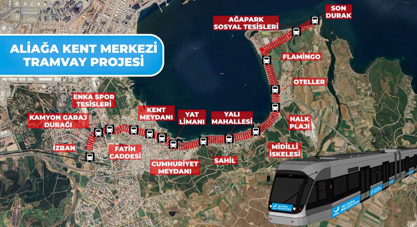 Aliağa’nın tam anlamıyla sosyal yaşam, kültür ve turizm kentine dönüşmesine katkı sağlayacak olan tramvay projesi 8 kilometre uzunluktaki bir hatta 15 durak ile İZBAN’dan başlayarak Ağapark Plajı ve Delta Park’a kadar keyifli bir ulaşım imkanı sunacak.