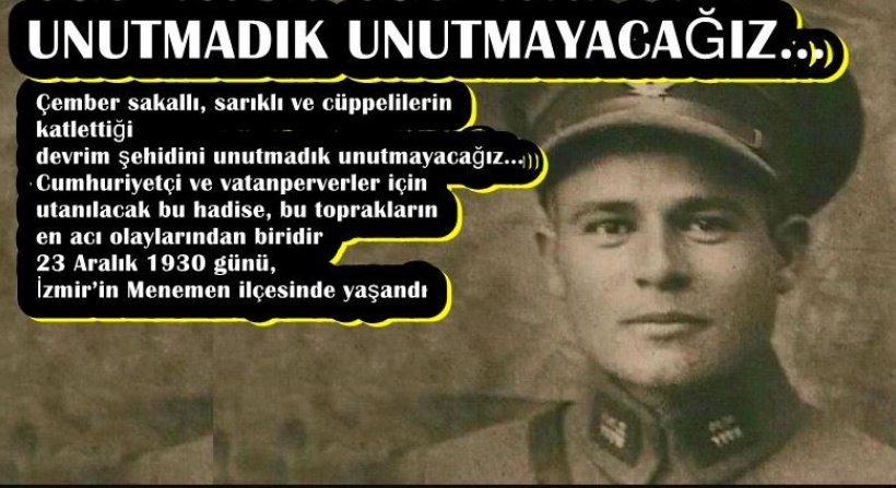 93 yıl önce, 23 Aralık 1930 yılında şeriat isteyen bir grup gerici tarafından katledilen Asteğmen Mustafa Fehmi Kubilay ve arkadaşları için anma mesajı yayınlayan CHP Aliağa Belediye Başkan Aday Adayı Oğuzhan Özşahin, Atatürk ilke ve devrimlerinin sonuna kadar savunucusu olacağını ifade etti.