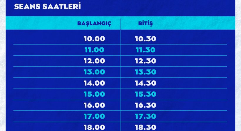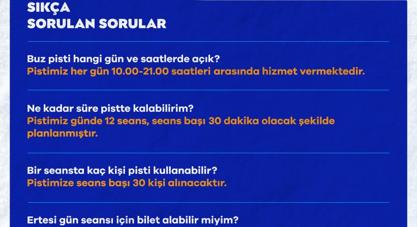 Buz pateni pisti haftanın her günü saat 10.00 ile 21.00 saatleri arasında açık olacak. Buz pistinde bir günde yarımşar saatten 12 seans yapılacak. Bu pistiniher seansta maksimum 30 kişi kullanabilecek. Vatandaşlarabuz pisti kullanımı için sadece aynı gün için bilet verilecek. Aynı gün içerisinde ileri saatlerdeki seanslara da bilet alma imkanı sunulacak. Buz pisti 14 Şubat tarihine kadar hizmet verecek.