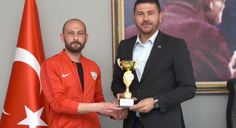 Taekwondo Antrenörü İlhan Eraslan, 1-2 Nisan tarihlerinde gerçekleşen Poomsae İzmir İl Müsabakalarında kazanılan takım 5.’liği kupasını Başkan Fatih Gürbüz’e takdim etti.