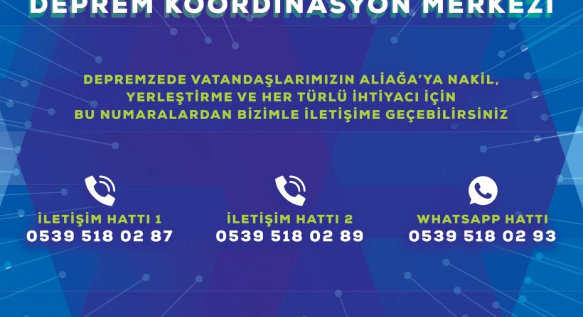 Depremzede vatandaşlar Aliağa’ya nakil, yerleştirme ve her türlü ihtiyacı için 0.539 518 0287 ve 0.539 518 0289 numaralı iletişim hatlarından ya da 0.539 518 0293 numaralı WhatsApp hattından Aliağa Belediyesi Deprem Koordinasyon Merkezi ile iletişime geçebilirler.
