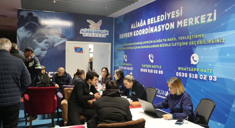 Aliağa Gençlik Merkezi’nde kurulan Aliağa Belediyesi Deprem Koordinasyon Merkezi’nde depremzedelerin Aliağa’ya nakil, yerleştirme ve her türlü ihtiyaçları karşılanıyor. Başvuru sonrası kayıtları alınan depremzedelerin barınma ve tüm ihtiyaçları temin edildikten sonra belediye ekiplerince barındıkları yerlere ulaştırılıyor.