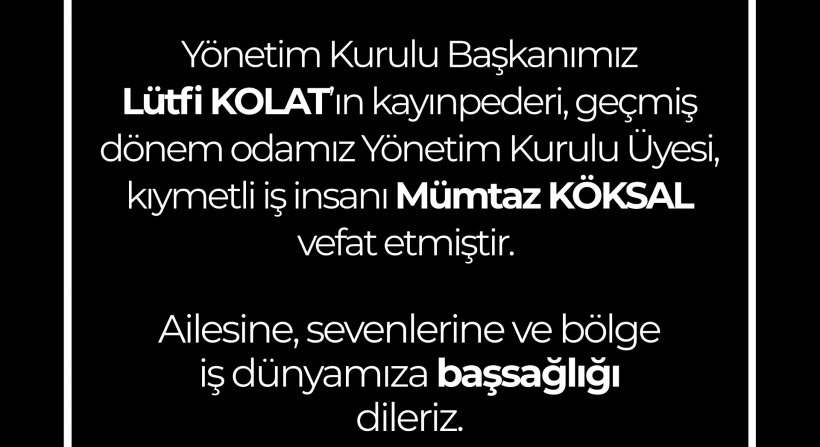 Bergama’nın köklü iş insanlarından, Bergama Ticaret Odası geçmiş dönem Yönetim Kurulu Üyesi ve mevcut Yönetim Kurulu Başkanı Lütfi Kolat’ın kayınpederi Mümtaz Köksal hayatını kaybetti.